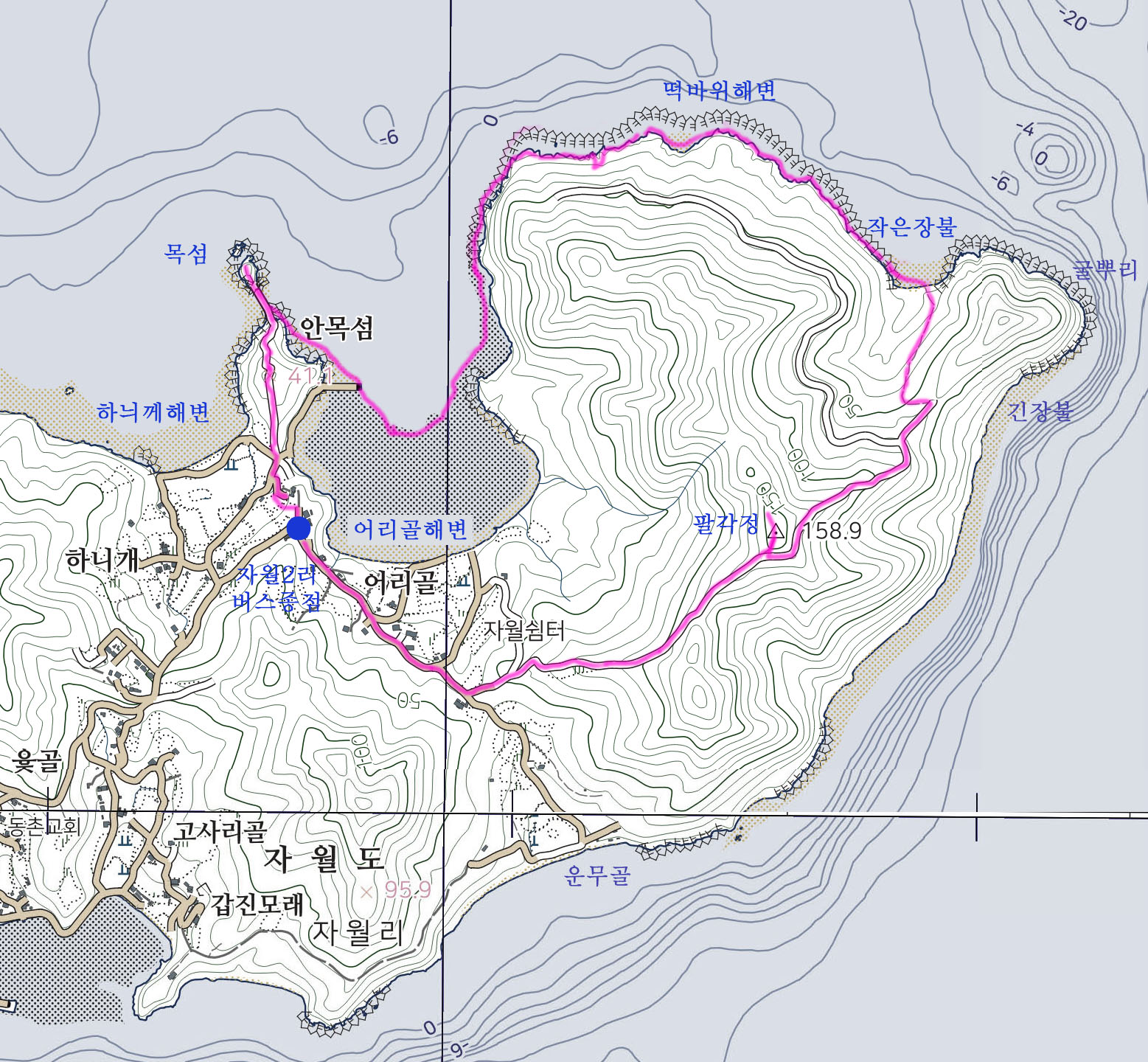어리골/자월2리종점-△158.9-작은장볼-떡바위해변-어리골해변-선바위-목섬-×41.1-어리골/자월2리종점