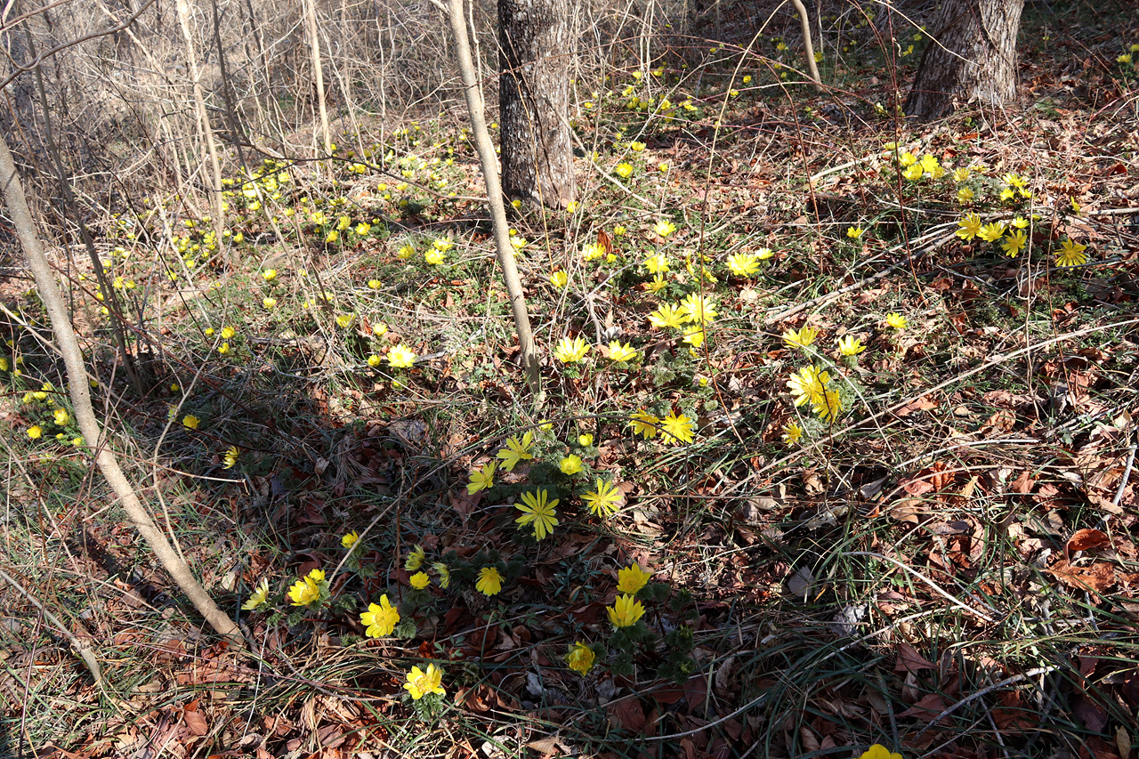 (숲속에서 복수초 몇 송이 발견)